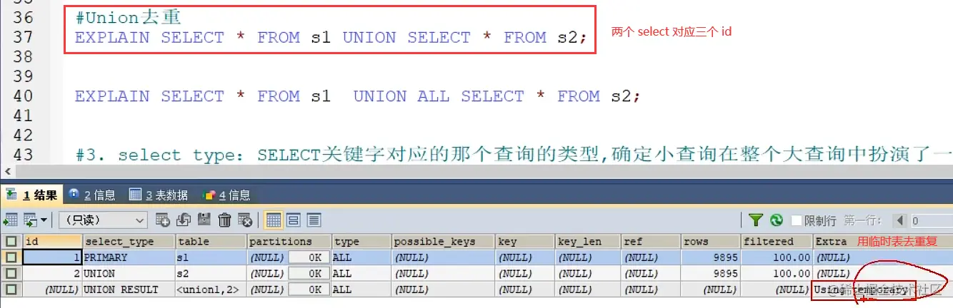 union all 就只有两个 id ,因为不需要去重操作