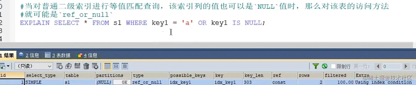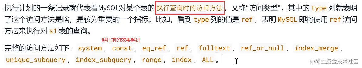 完整的访问方法如下: system(Hash索引) , const (唯一索引+等值匹配), eq_ref , ref , fulltext , ref_or_null ,