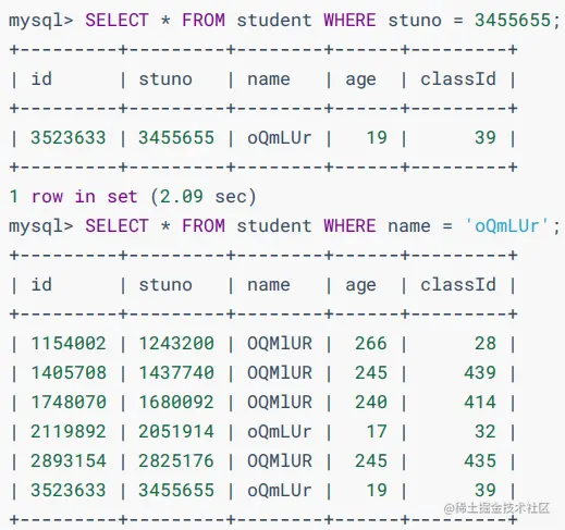 从上面的结果可以看出来,查询学生编号为“3455655”的学生信息花费时间为2.09秒。查询学生姓名为