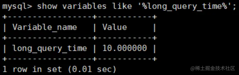 mysql> show variables like '%long_query_time%';