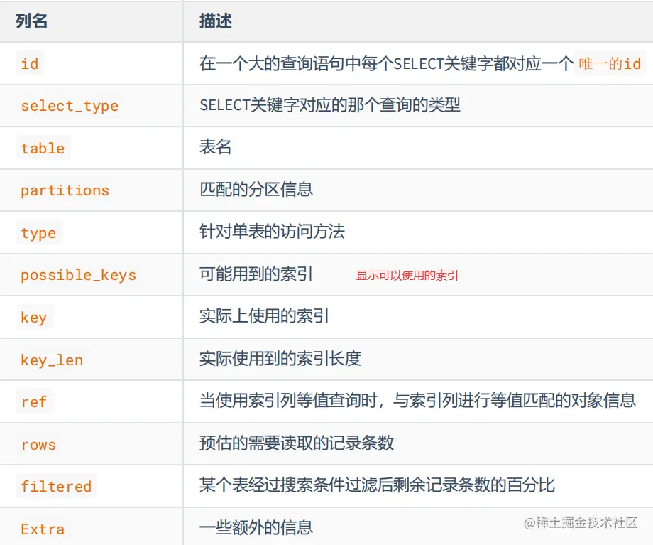 EXPLAIN 语句输出的各个列的作用如下:
