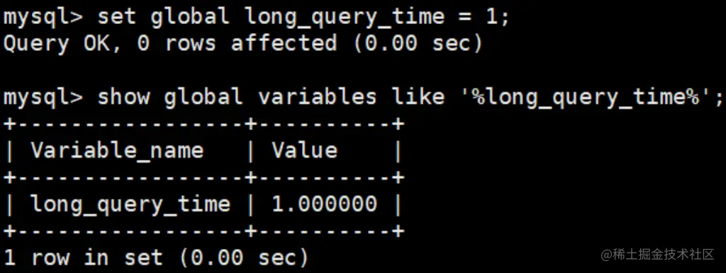 mysql > set global long_query_time = 1; mysql> show global variables like '%long_query_time%';