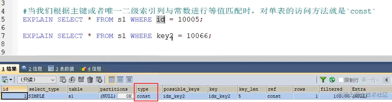 const(找到就马上返回,注意点:唯一索引、等值匹配、单表)