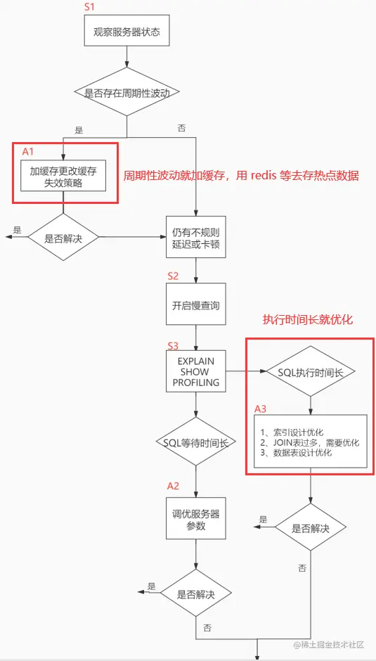当我们遇到数据库调优问题的时候,该如何思考呢?这里把思考的流程整理成下面这张图。