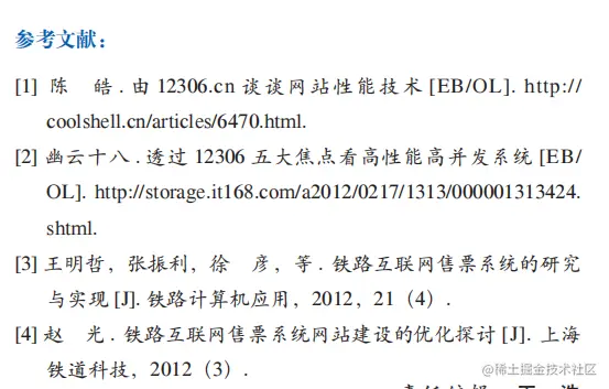 五一的时候偶然阅读了12306架构的文章,想进一步去找相关论文资料,才发现这篇论文的参考文献居然也有耗子叔的博客文章: