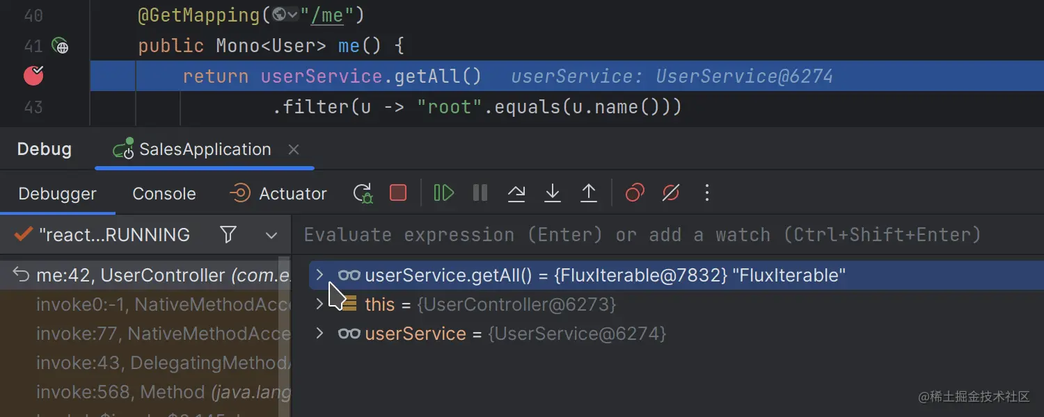 在调试反应式应用程序时,你现在可以轻松评估 Mono 和 Flux 类型的 watches 和局部变量的值。 IDE 现在会在调试会话期间检测到它们,并在变量视图中提供相应的 get 或 collectList 链接,你可以单击该链接以立即计算反应流项目。