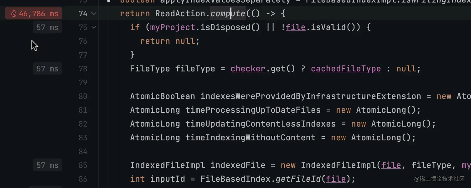 通过此添加,来自 IntelliJ Profiler 的数据直接在编辑器中可视化 —— 执行时间和内存分配数据显示在相应代码行旁边的 gutter 中。这些注释采用 color-coded,可帮助你立即了解哪些方法最需要注意的。占用 parent method 大部分时间的调用以红色突出显示,如果总执行时间受到显着影响,它们将另外显示一个 fire 图标。