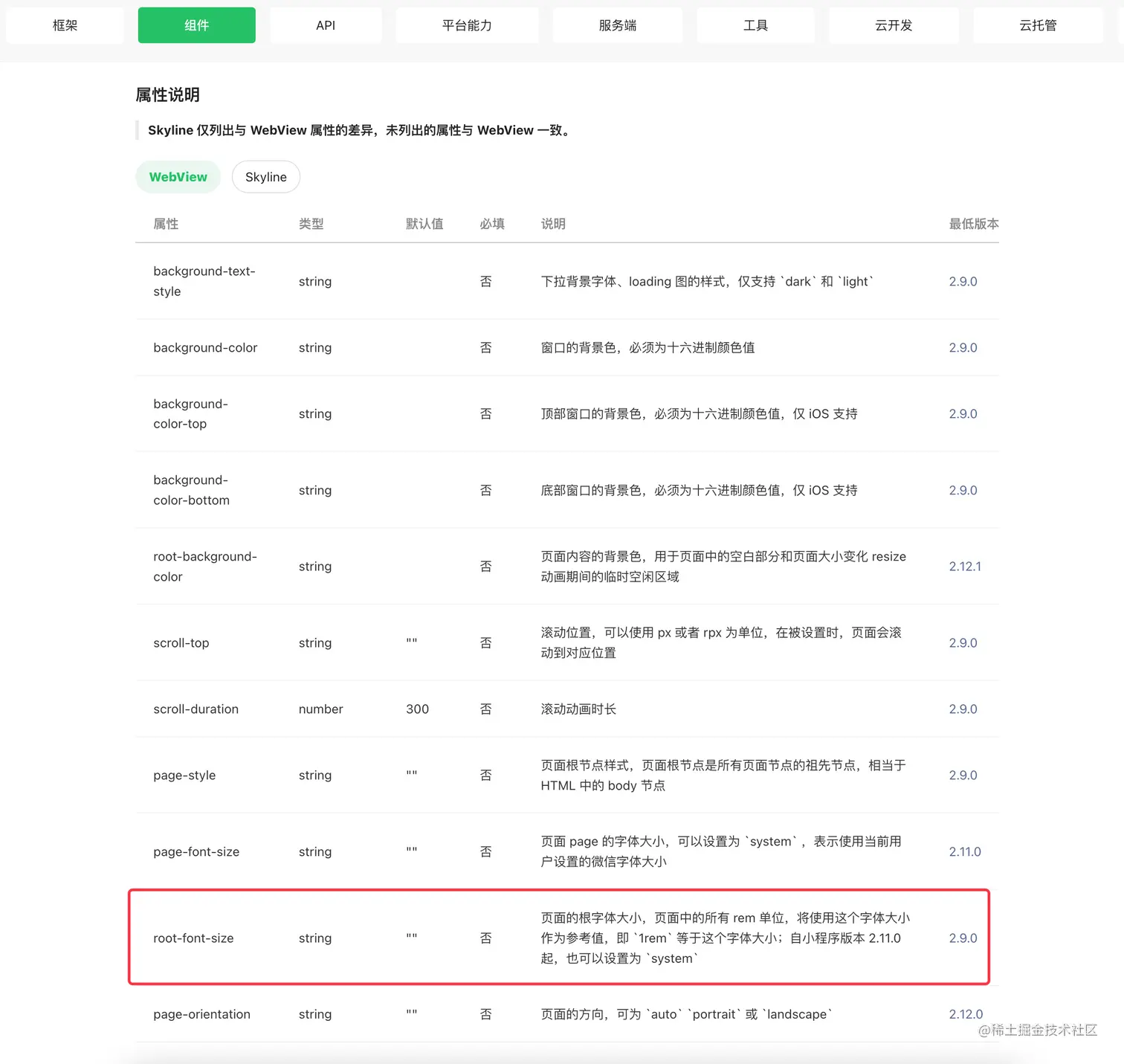 在小程序中,我们也是可以用 rem 单位的,可以在 app.wxss 中给 page 标签设置字号大小,然后在自定义组件中使用方式和 web 端是一致的。但是至今为止,微信小程序官方并未开放 全局动态设置 page 样式的相关 api,或者直接修改 app.wxss 的 方式,因此这个方案在小程序中是行不通的。值得庆幸的是,虽然没有直接设置 page 样式这样的 api,但是官方在版本号 2.9.0 之后,出了 page-meta 这样的页面属性配置方案,其中 root-font-size 就是页面的根字体大小属性。接下来我们就利用这个配置项来完成小程序的方案。