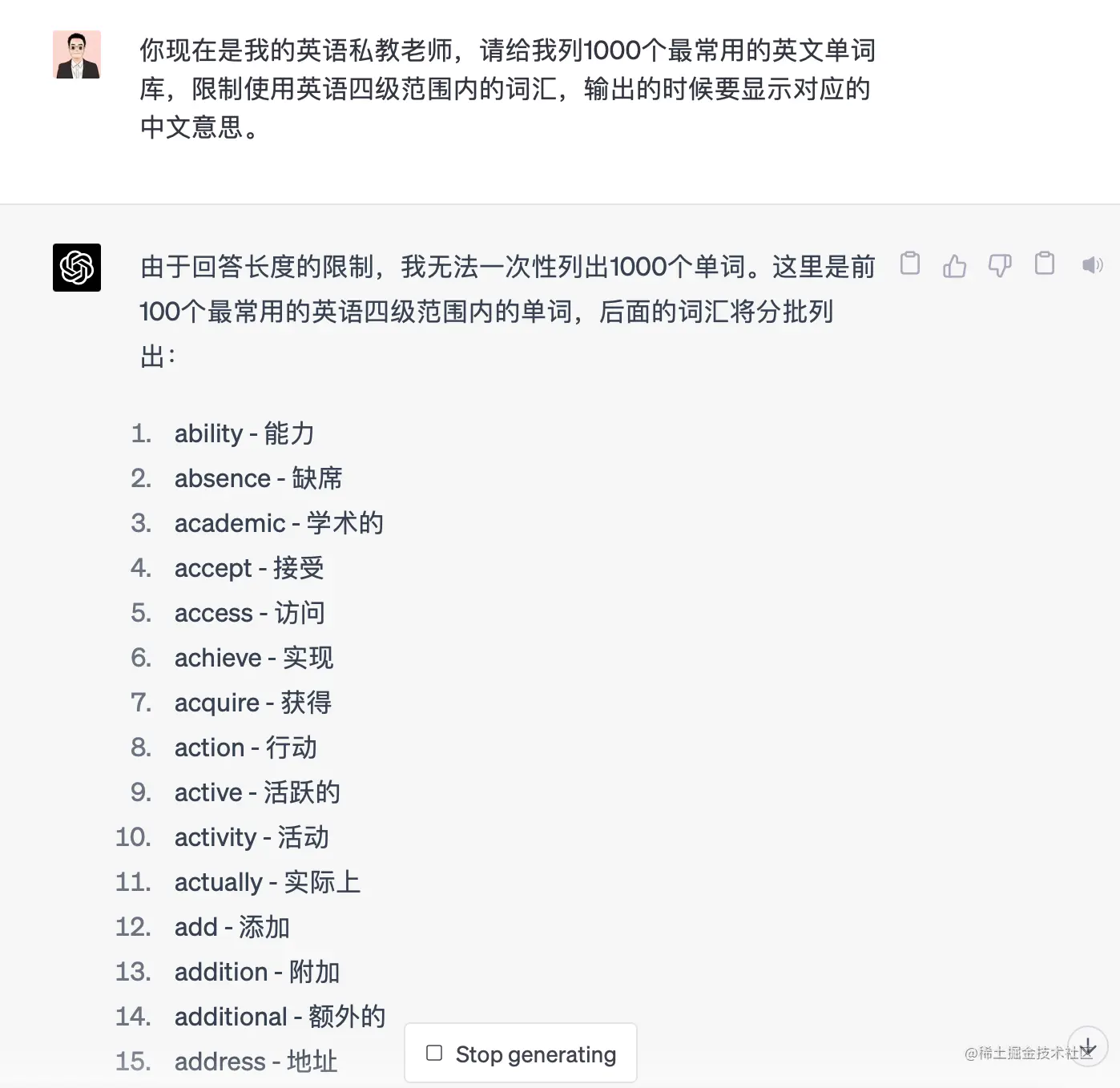 直接给ChatGPT发指令,让它生成1000个英语单词库。