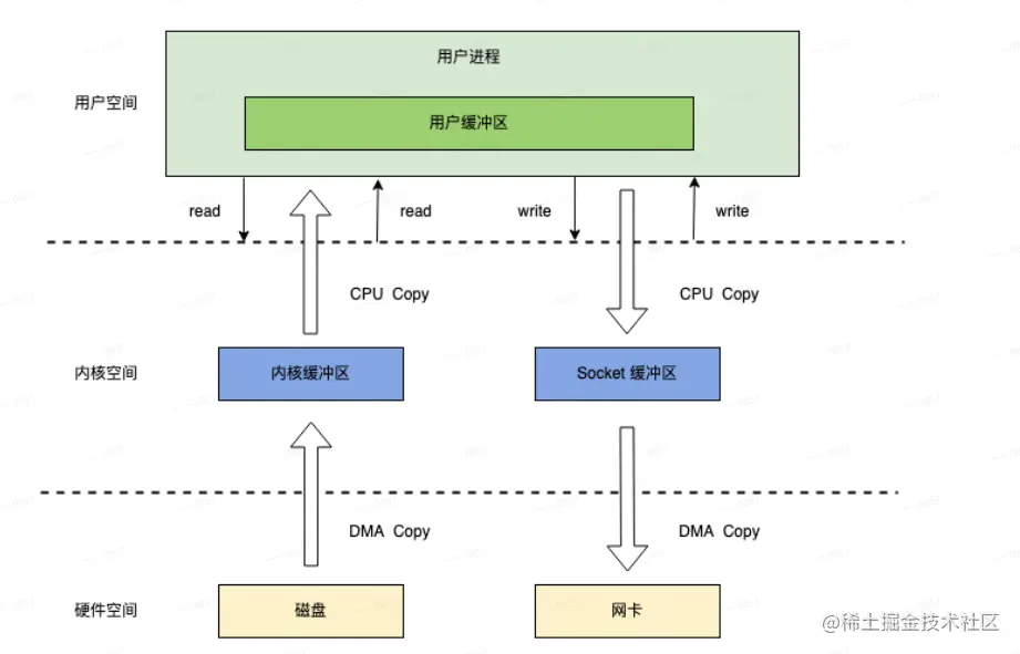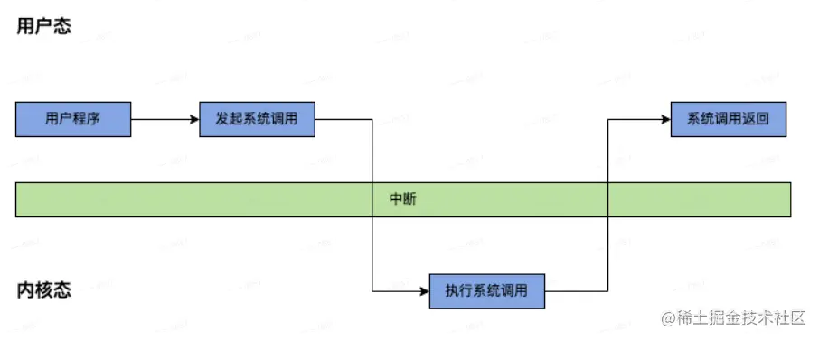 内核空间:系统内核运行的空间 用户空间:应用程序运行的时间。用户调用系统程序,需要经过用户态到内核态再到用户态,如下图所示: