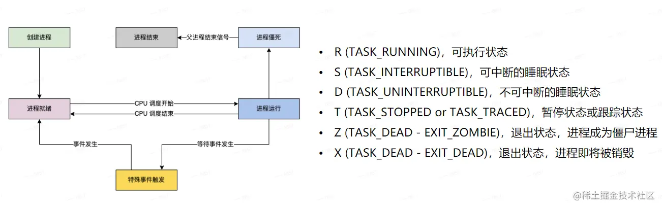 进程管理是Linux的一个重要功能。进程是正在运行的程序,Linux系统通常有数百个进程同时运行。每个进程都有自己的地址空间,进程是资源分配的最小单位。一个CPU核同一时刻只能运行一个进程,Linux通过进程调度实现多个进程的运行。进程调度是指操作系统按照某种策略或规则选择进程占用CPU运行的过程。操作系统中进程从创建到结束的工作流程如下图所示。