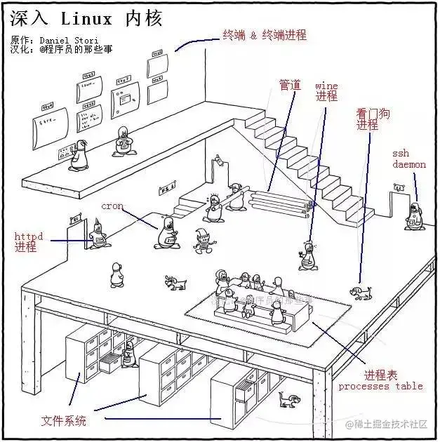 地基(底层)由一排排的文件柜组成,井然有序,文件柜里放置着“文件”——电脑中的文件。左上角,有一只胸前挂着 421 号牌的小企鹅,它表示着 PID(进程 IDProcess ID) 为 421 的进程,它正在查看文件柜中的文件,这代表系统中正有一个进程在访问文件系统。在右下角有一只小狗,它是看门狗watchdog ,这代表对文件系统的监控。中间层,有众多小企鹅在围着着桌子坐着。这个桌子的区域代表进程表。桌子的上方有一个站着的企鹅,好像在指挥这一桌子企鹅,它代表着 Linux 内核中的初始化(init)进程,也就是常说的 PID 为 1 的进程。桌子上坐的小企鹅都在等待状态wait中,等待工作任务。桌子周围有两只狗,它会监控小企鹅的状态(监控进程)。图中有两只企鹅,在一起搬一根管道,一只小企鹅可以把自己手上的东西通过这个管道,传递给后面的小企鹅。cron进程是图中那只冒汗的企鹅,它执行着周期性任务。pid为1341的小企鹅就是大名鼎鼎的apache http服务器进程。它坚守在80端口提供http服务。它头上的羽毛就是apache的标志。52号企鹅看护的是用于SSH服务的22端口,SSH服务常常用于远程登陆,所以它看起来很严肃。端着红酒的411号企鹅就是wine,可以在Linux上运行一些简单的windows程序。最顶层是两只在名为TTY的窗口面前工作的企鹅,一只企鹅在控制台前戳戳点点,另一只在仔细端详程序的输出。tty(终端)是对外沟通的渠道之一,但是,不是每一个进程都需要 tty,某些进程可以直接通过其他途径(比如端口)来和外部进行通信,对外提供服务的,所以,这一层不是完整的一层,只是个跃层。