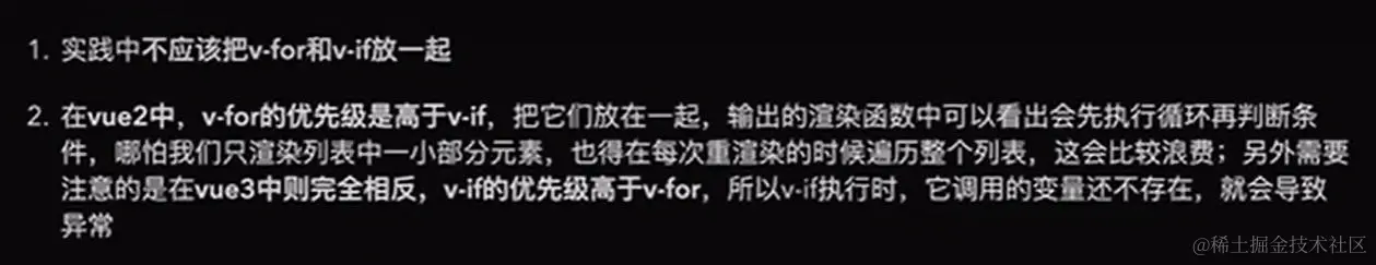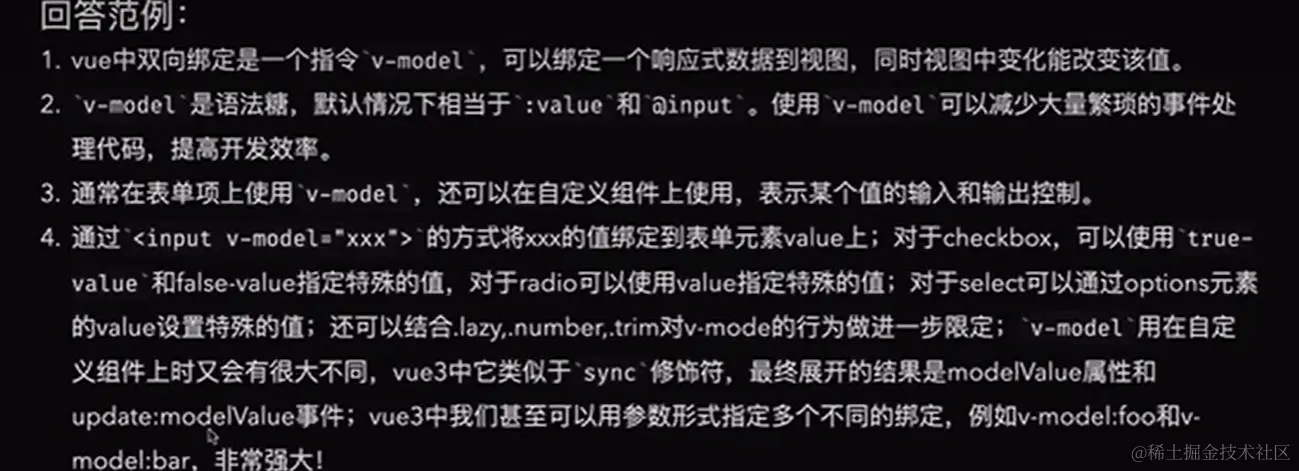 vue面试题-01 知来者之可追 2023-05-16 153 阅读1分钟 1. 组件通信方式 父子props,emit, 兄弟eventBus, 非关系组件 vuex, v-model , sync可以在组件上使用以实现双向绑定。 2. v-if, v-for优先级 vue2源码里面把, v-if变成了三元表达式, 先执行循环,再执行判断, v-if嵌套在 v-for的循环中 3. 生命周期 4. 双向绑定