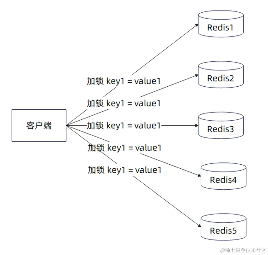 比如说我们部署五个主节点,那么加锁过程是类似的,只是要在五个主节点都加上锁,如果多数(这里是三个),都成功了,那么就认为加锁成功。
