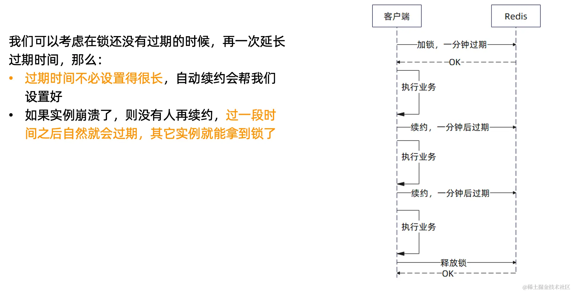 - 怎么延长过期时间(续约)?什么时候续约,续约多久,续约失败怎么办。续约失败之后,无非就是中断业务执行,并且可能还要执行一些回滚或者补偿动作。