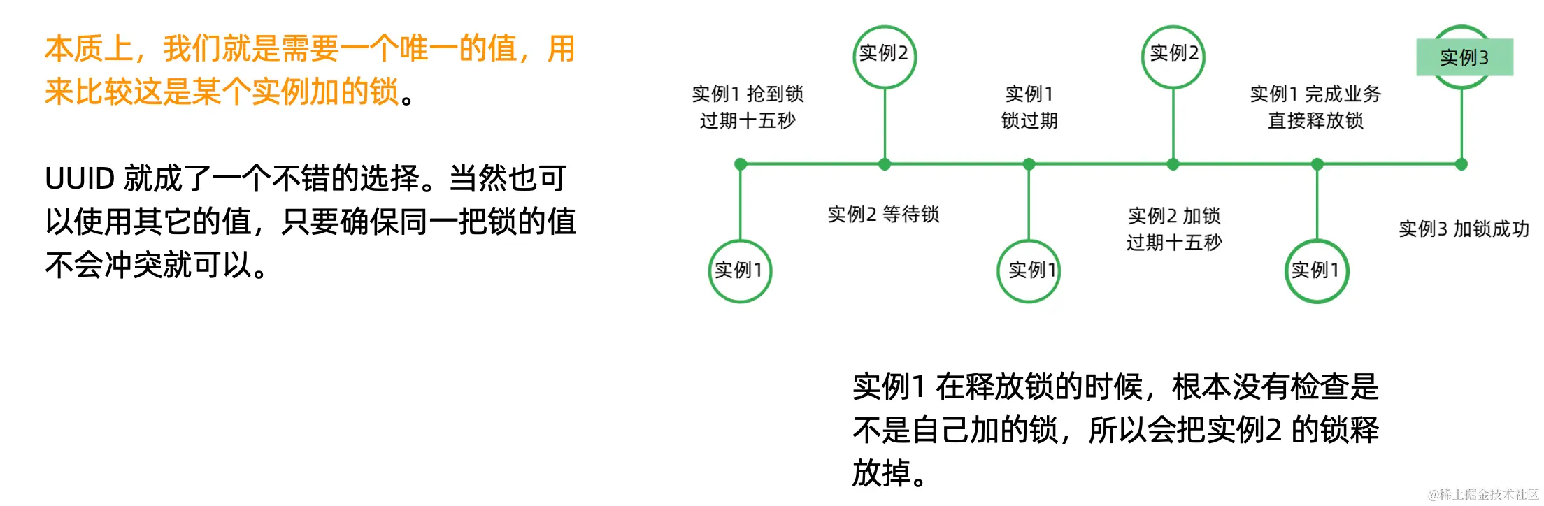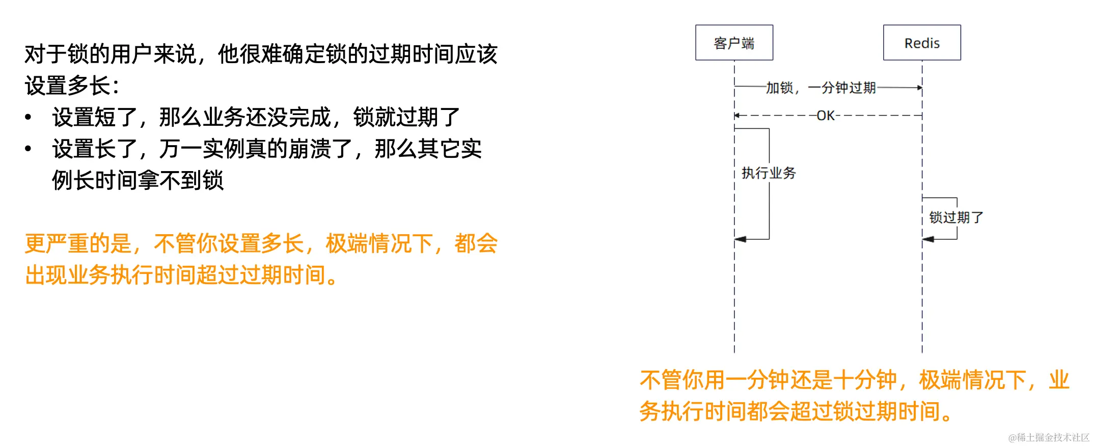 - 分布式锁的过期时间怎么设置?按照自己业务的耗时,例如999线的时间设置超时时间,重要的是引入续约机制。