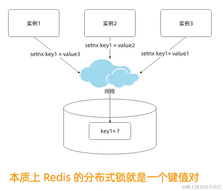 实现一个分布式锁的起点,就是利用 setnx命令,确保可以排他地设置一个键值对。