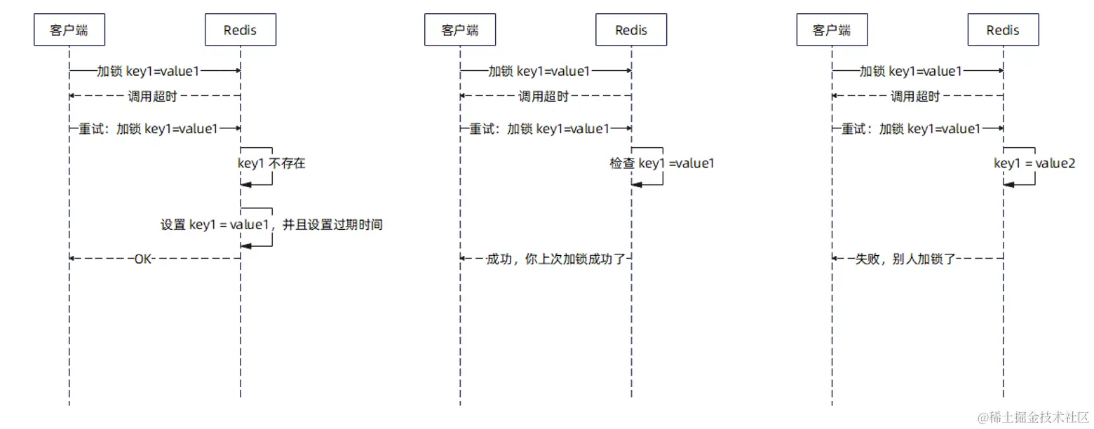 实际上,释放锁也可以考虑重试,只是相比之下,释放锁问题没那么严重。释放锁的情况下只有超时是值得重试的,其他情况都不需要重试。