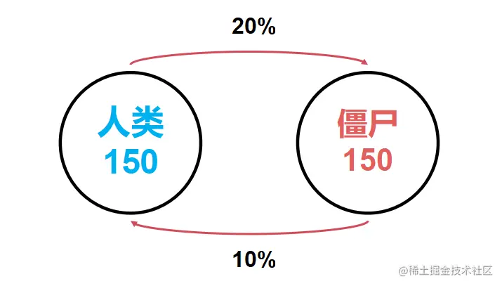 此刻,如果有150个僵尸和150个人类,那么长期下来会发生什么呢?