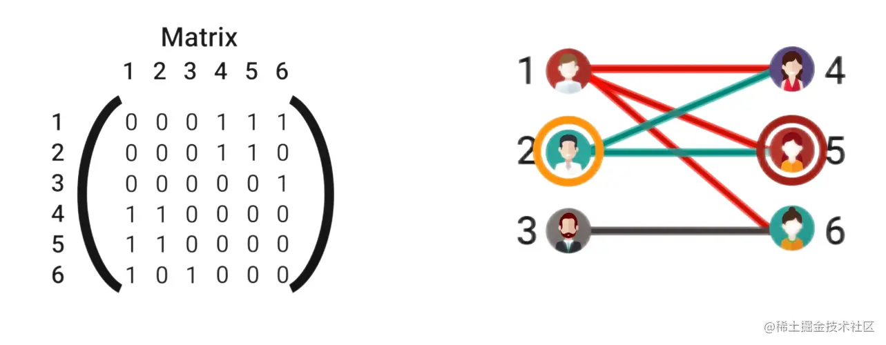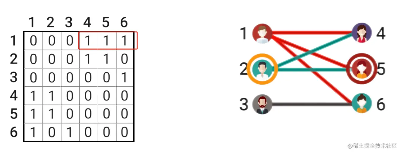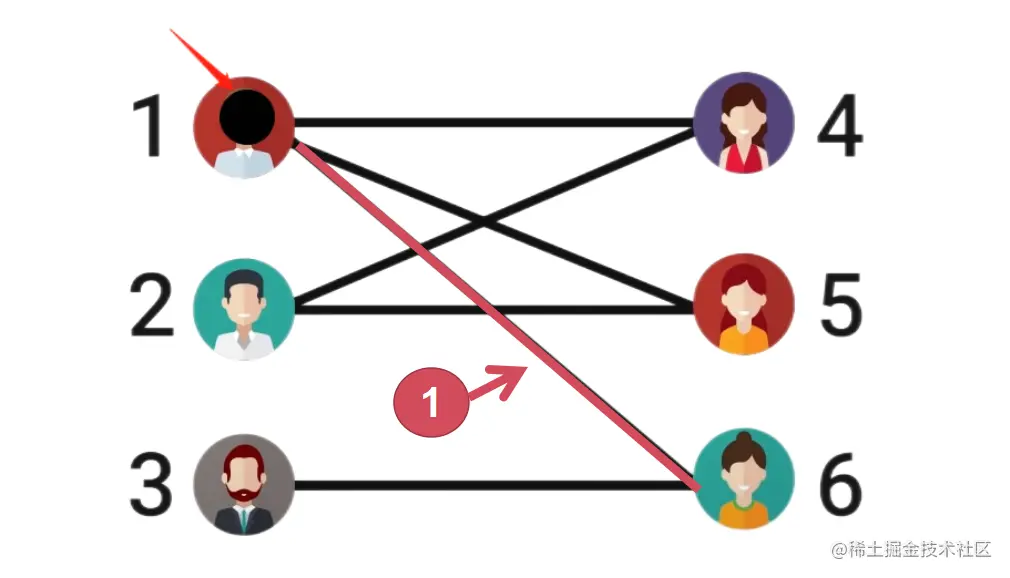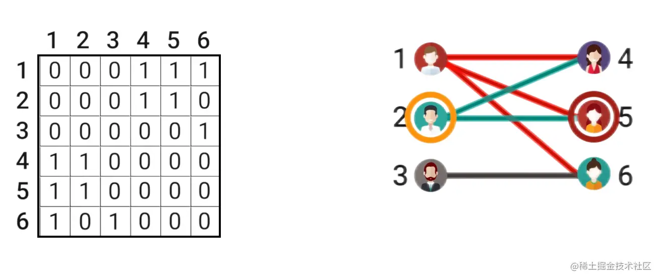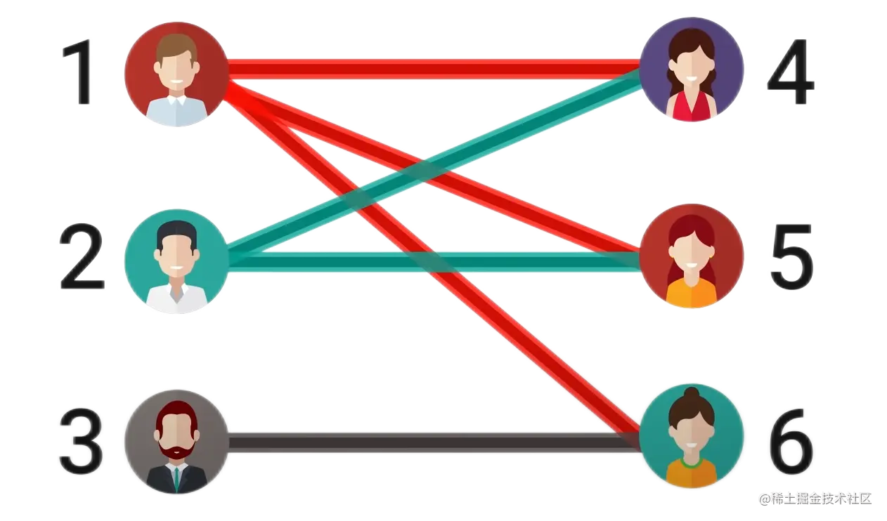 在约会软件方面,假设这个APP中只有三个男性(标签为1到3)和三个女性(标签为4到6)注册,并且他们彼此如图所示的相互连接。