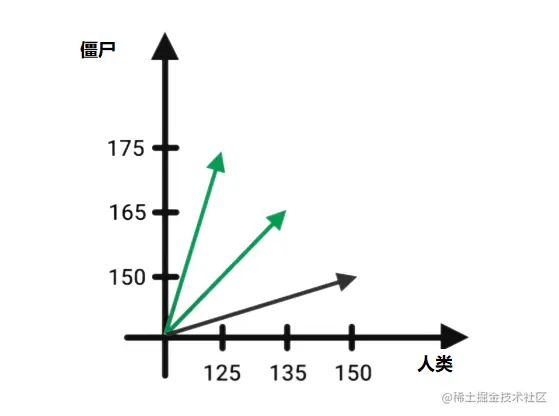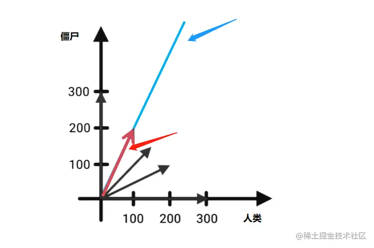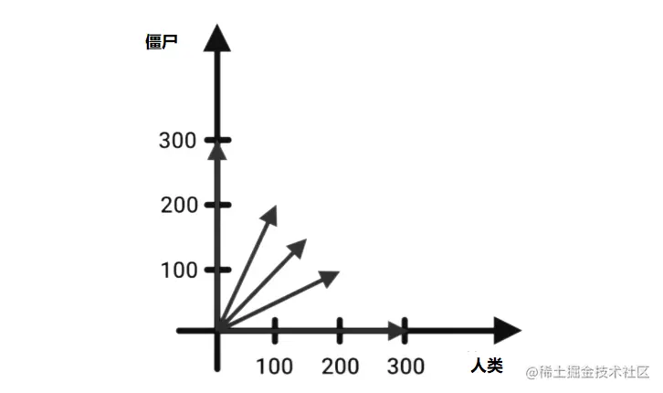 让我在图上画出几个向量来展示这个过程,每个向量代表加起来是300的总人口。