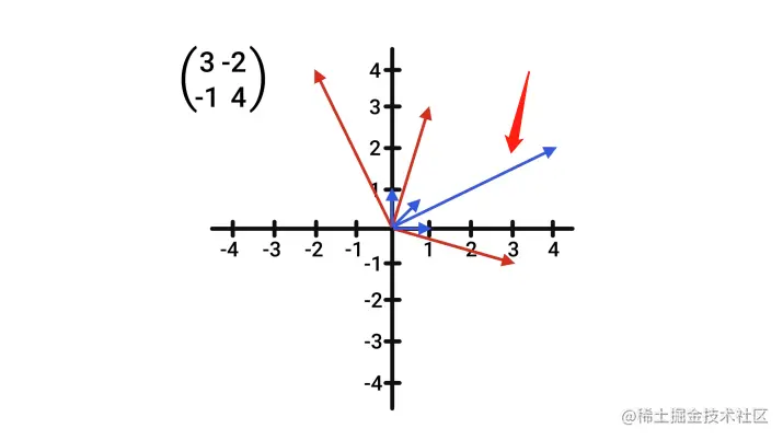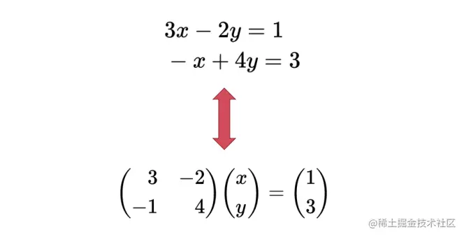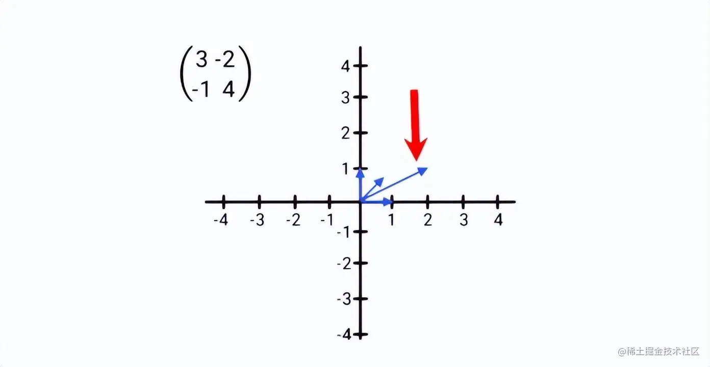 X分量在顶部,Y分量在底部。当我们通过乘法规则将其乘以一个2x2矩阵时,得到一个新的矢量,
