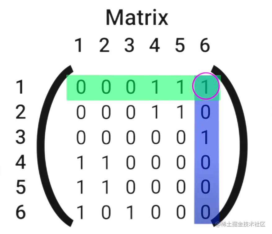 这到底是什么意思呢?我们看一下第6列和第1行,我们知道这表示那两个人是匹配的。但它也意味着,它们之间存在一条长度为1的路径。