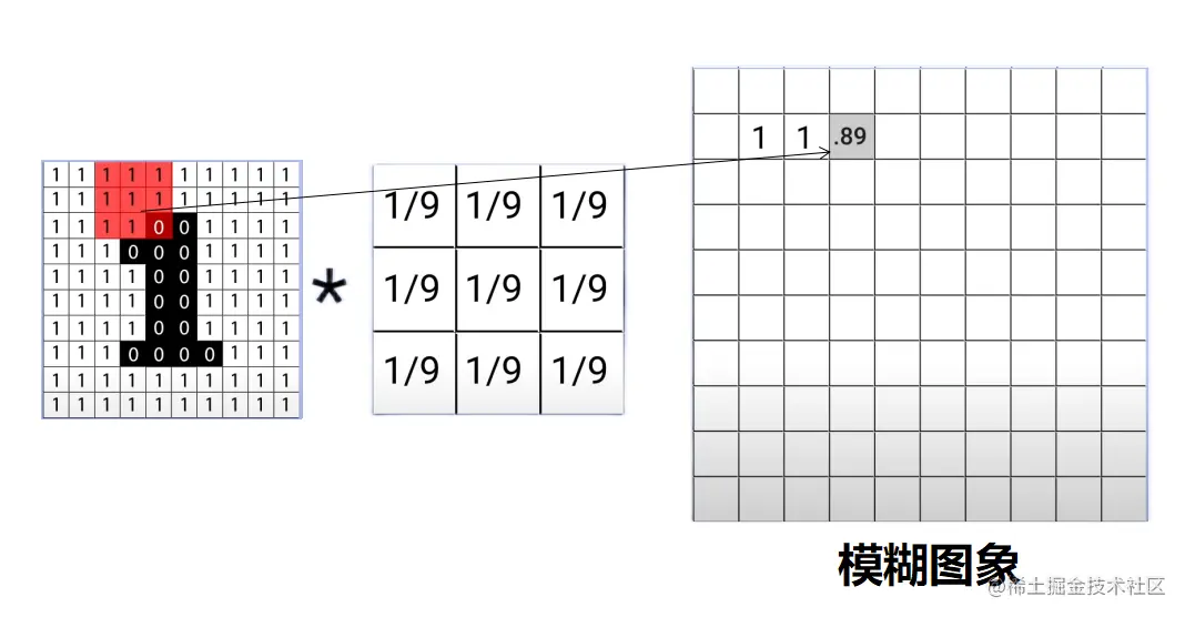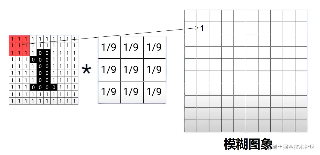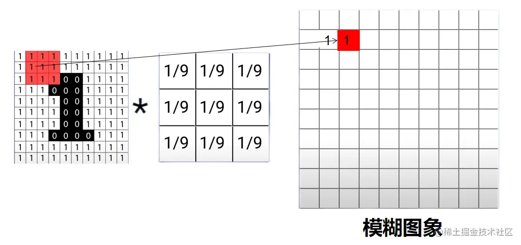 接下来,我们要将这个内核覆盖在图像矩阵上,然后将每个方格中的各项相乘,再将结果相加。在这个例子中,它只是1乘以1/9九次,所以总和是1。