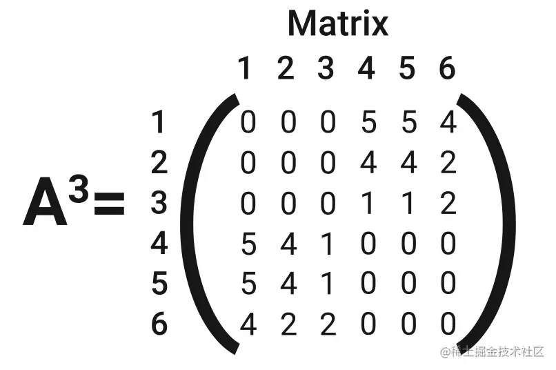 然后,如果我们将新矩阵乘以原始矩阵,就相当于求原始矩阵的立方,可以得到一个人到另一个人之间长度为3的所有路径。