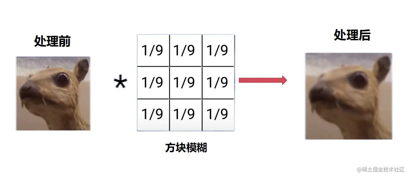 之所以如此模糊,是因为我们只处理了100个像素。但内核的作用是在原始图像中,在黑色和白色之间的锐利边缘处进行平滑或平均,这样我们就可以在模糊图像中看到从黑色到浅色的过渡。我们使用的内核代表了一种称为方块模糊(box blur) 的模糊类型。