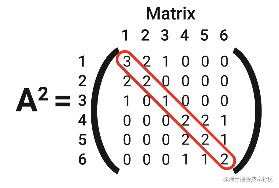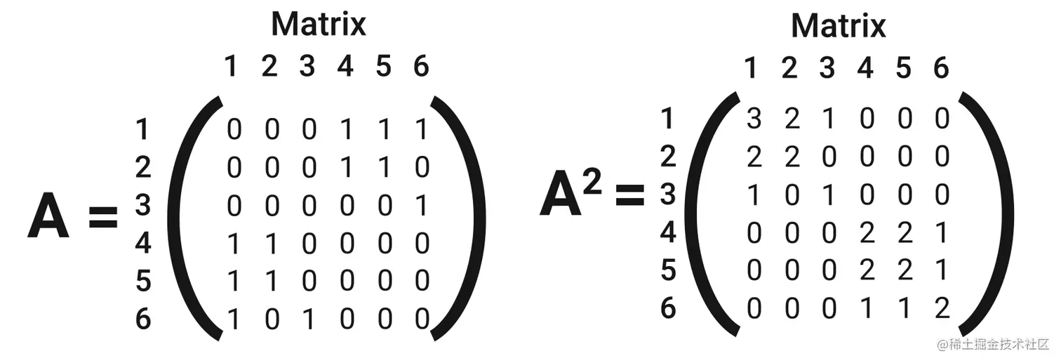 这表示一个人与他们自己之间存在长度为2的路径。也就是说,他们有多少个匹配。对于1号这个人,如果他自身开始,要在两条边内回到1号,可以先走到4号,然后回到1号,或者先走到5号,再回到1号,又或者先走到6号,再回到1号,总共有3个选择,这就是为什么我们在矩阵中看到那里有一个3。对于拥有两个匹配的2号人物,情况也是如此。