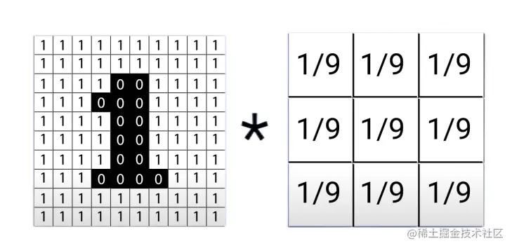 举个例子,我们来数学地模糊这个数字1的图像。为此,我将创建一个3x3矩阵,其中每项都是1/9,这在图像处理中被称为内核( kernel,即3x3矩阵 ) 。