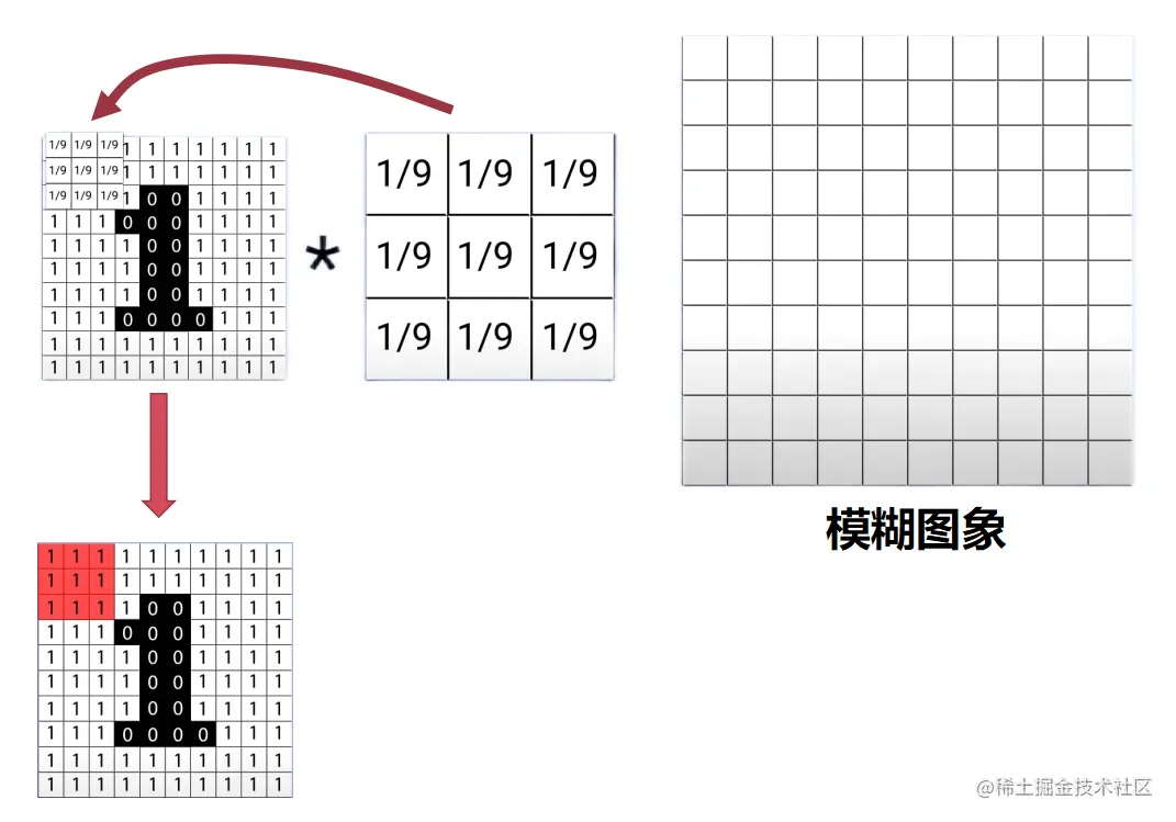 现在,你会注意到右边的网格(模糊图像将出现的地方)与左边的网格大小相同。为了获得整个模糊图像,我们只需在原始图像上扫描红色区域。当向右滑动一格时,所有这些像素仍然是1,所以平均值也是1,这就是这个新像素的来源。