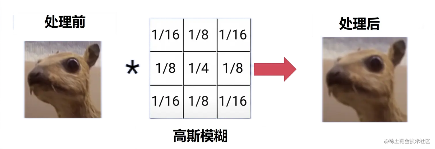 如果你输入一个像素较多的图片,然后应用模糊,就会得到模糊的效果。但还有其他几种内核,它们能达到不同的效果。高斯模糊也会模糊图像,但它为中心方格分配更多权重,