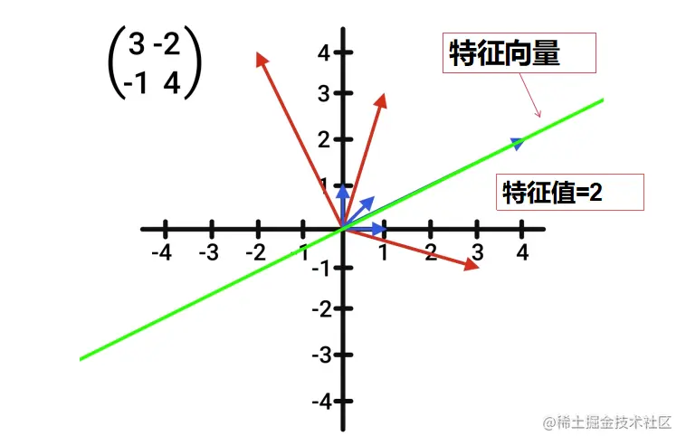 而且这会发生在与该输入(1,2)在同一直线上的任何矢量上。任何只被矩阵缩放而不被旋转的矢量被称为该矩阵的特征向量(Eigenvector) ,而向量被缩放的程度(在本例中是2,因为长度加倍了)称为特征值(Eigenvalue) 。