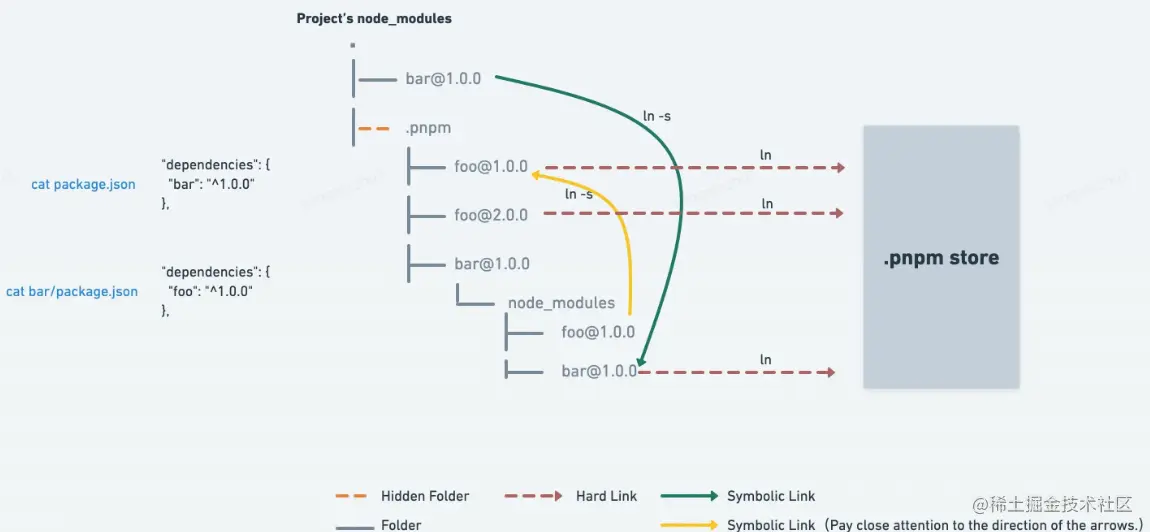 pnpm 通过链接( links)与全局存储空间(store)管理的不同项目的 node_modules 依赖。硬链接(hard links)能指向磁盘上原始文件所在的同一位置(store),但是因为 pnpm 的 node_modules 是树形目录结构,且硬链接只能用于文件不能用于目录,因此需要通过软链接(symbolic link)来实现目录寻址,通过如下一张项目依赖关系图可以更好的理解 pnpm 是如何进行依赖寻址的。