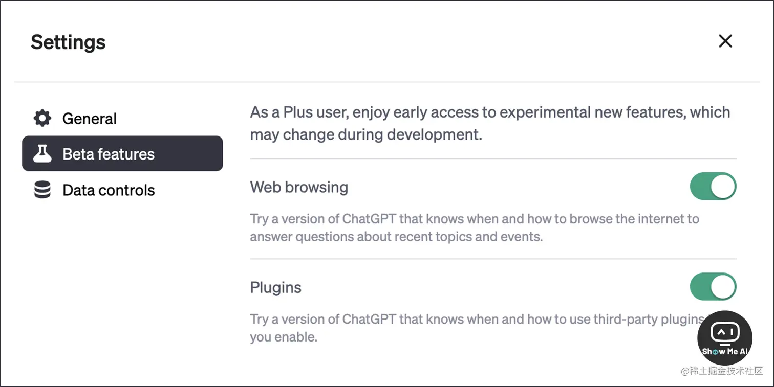 5月13日,OpenAI 的 CEO Sam Altman 和总裁 Greg,都在推特上转发了一条消息:所有ChatGPT Plus 用户将在下周获得 Web Browsing 和 Plugins 权限。用户获得权限以后,会在设置页看到 eta Features 的功能并可以打开这两项。