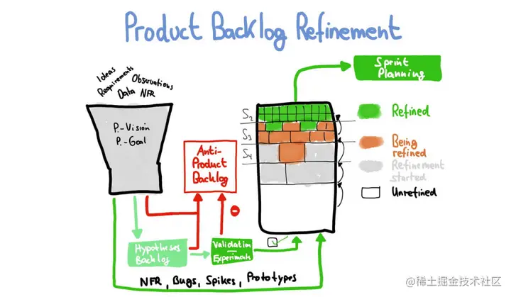 已采纳的研发需求会被记录在产品待办列表(Product Backlog)中,经过需求分析、需求拆分、需求评审、优先级排序、工作量估算等一系列步骤,变成一个个清晰明确的小粒度、高优先级的用户故事。这个过程会剥离出当前优先级/价值较低的需求,继续接受待办列表细化的考验。