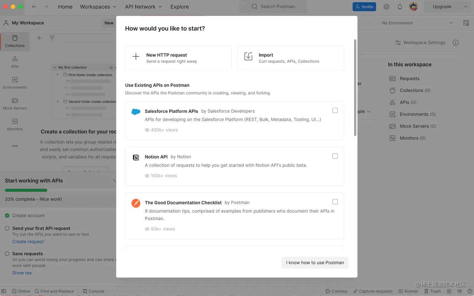 注册完成后,会重新出现这个界面,点击“打开 Postman ”即可成功在 Postman 客户端中打开。