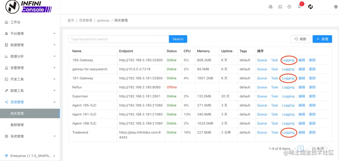 登录 Console,进入 [资源管理][网关管理] 界面,可以看到网关实时日志入口(前提需要注册网关)如下图所示: