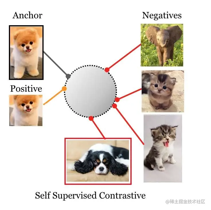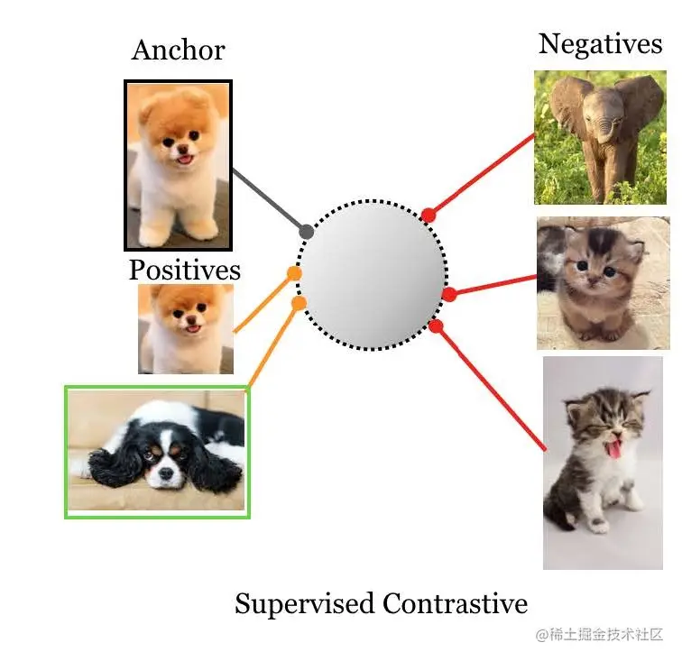 基于以上问题,为了让同一类的图片feature距离接近,Google设计了一个supervised contrastive loss,将对比学习和监督学习相结合,达到更好的效果。下图所示同一小狗类相互接近,猫类和小狗类相互分开。