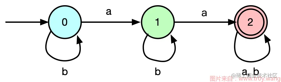 我们再详细地看它的转移函数,每个状态,遇到特定的一个输入,都只有一个路线可以走,那么这种状态机就叫做 DFA(确定状态有限状态自动机) 。