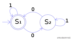 上图中的状态机的功能,是 检测二进制数是否含有偶数个 0 。从图上可以看出,输入只有 1 和 0 两种。从 S1 状态开始,只有输入 0 才会转换到 S2 状态,同样 S2 状态下只有输入 0 才会转换到 S1。所以,二进制数输入完毕,如果满足最终状态,也就是最后停在 S1 状态,那么输入的二进制数就含有偶数个 0。