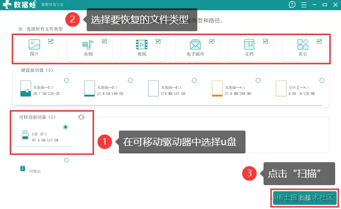 - 进入软件后,先在 【可移动设备】 中勾选u盘,再对需要恢复的文件类型进行选择(一般建议全选),选择完毕,点击 【扫描】 ;
