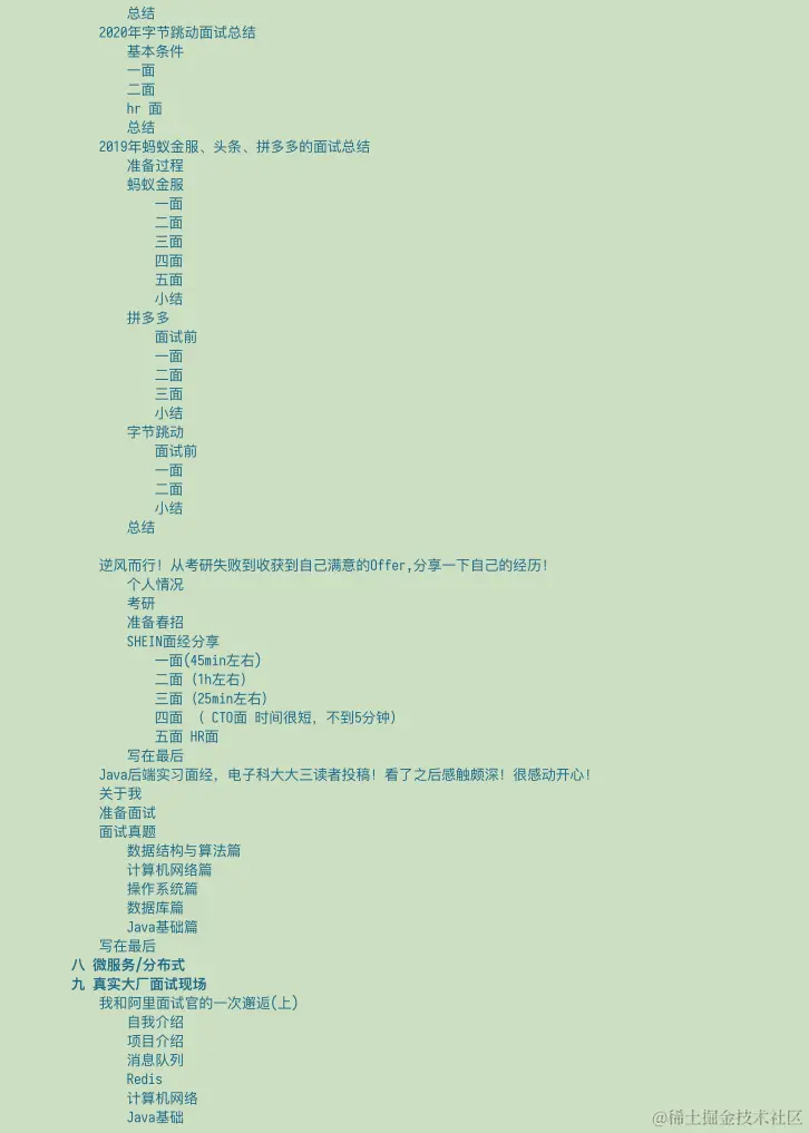 在这里我为大家准备了一份超级全面的Java 学习面试笔记,这份电子版笔记涵盖了诸多后端技术栈的面试题和答案(包括:bug调试、dubbo、git、github、idea、diea插件、java、Linux、maven、mybaits、restful、Redis、sql、springcloud、springboot、spring全家桶、zookeeper、分布式、前后端分离、架构、设计模式、面试面面经等知识点。) 相信可以帮助大家在最短的时间内复习Java后端的大多数技术点和面试题,从而拿到自己心仪的offer。