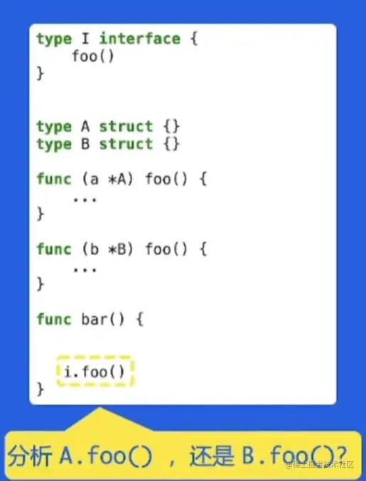 - 需要通过数据流分析得知i的具体类型,才能知道i.foo()调用的是哪个foo()
