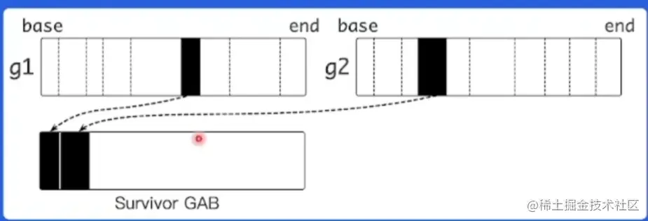 - 当GAB总大小超过一定阈值时,将GAB中存活的对象复制到另外分配的GAB中