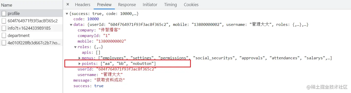 用户登陆成功后,用户可以访问的按钮级别权限保存在 points 数组中。而这个数据我们是保存在 vuex 中的,因此可以在项目的任意地方来访问 points 中的数据。