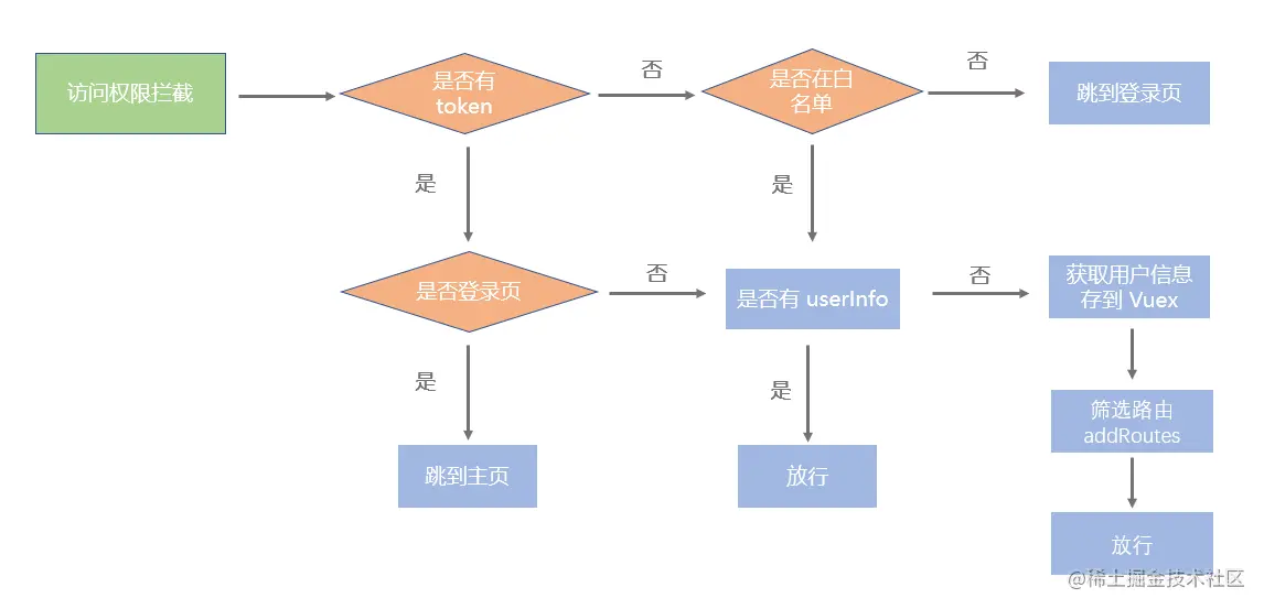 router.beforeEach(async(to, from, next) => { const token = store.getters.token NProgress.start() // 开启进度条 // 判断是否携带token if (token) { // 携带token的情况 if (to.path === '/login') { // 由于已登录,若前往登录页,则拦截至首页 next('/') Message.warning('您已经登录,请勿重复登录') NProgress.done() // 关闭进度条 } else { next() // 如果存在 token,访问的是其他页面,直接放行 if (!store.getters.userId) { const menus = await store.dispatch('user/getId') // 根据用户实际的权限 menus 从asyncRouteArr里, 过滤出用户能访问的页面的路由对象 const filterRoutes = asyncRouteArr.filter((route) => { const routeName = route.children[0].name.toLowerCase() return menus.includes(routeName) }) // 在路由添加完成后再添加404的页面 filterRoutes.push({ path: '*', redirect: '/404', hidden: true }) router.addRoutes(filterRoutes) // 将动态路由传递给 mutation 方法,进行合并 store.commit('permission/setRoutes', filterRoutes) // router.addRoutes({ path: '*', redirect: '/404', hidden: true }) // 解决刷新出现的白屏bug next({ path: to.path, // 保证路由添加完了再进入页面 (可以理解为重进一次) replace: true // 重进一次, 不保留重复历史 }) } // console.log(111) // store.dispatch('user/getId') } } else { // 没有携带token的情况 // 判断是否在白名单中 if (whiteList.includes(to.path)) { next() // 直接放行 } else { next('/login') // 拦截到登录页 // Message.warning('您还未登录,请先登录') console.log('拦截到登录页') NProgress.done() // 关闭进度条 } } next() })