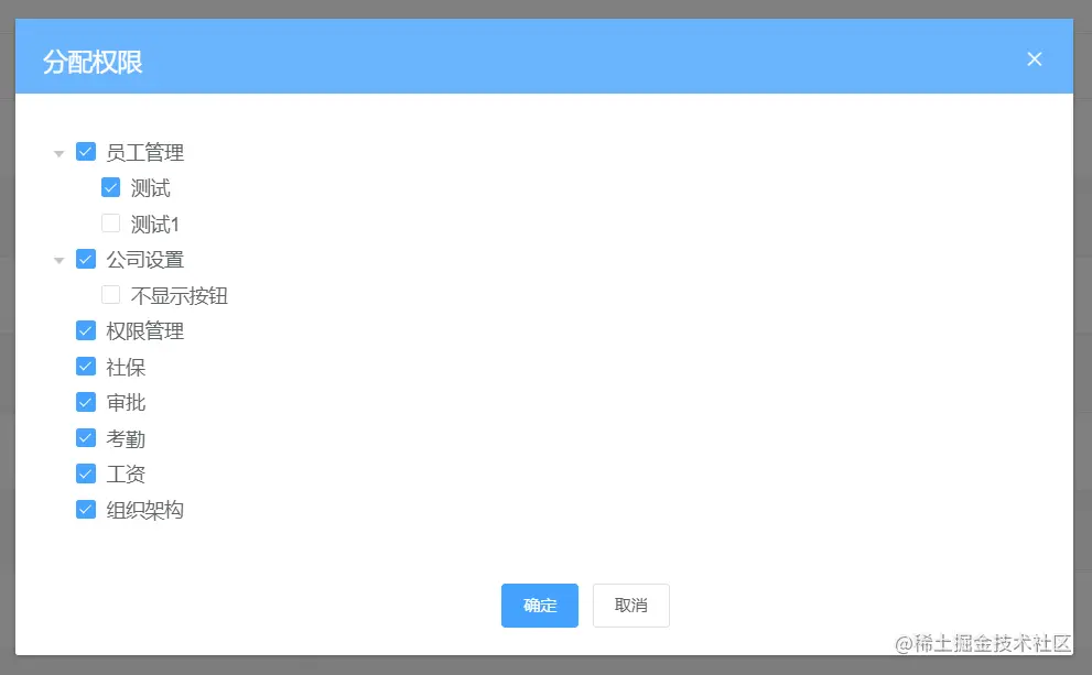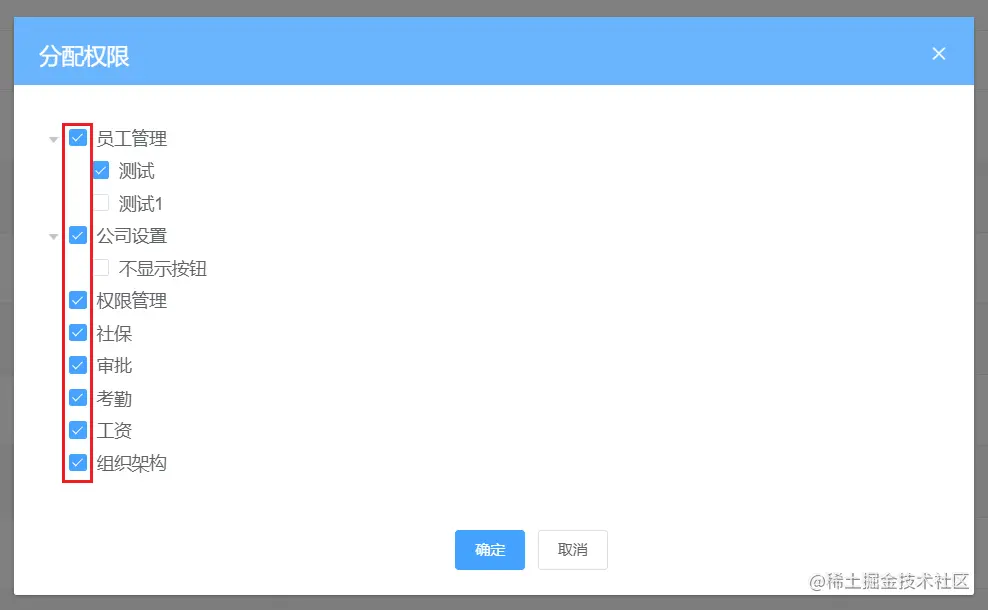 给分配权限弹框中的权限前面添加复选框、同时让组件默认展开